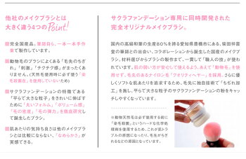 (天然毛使用時に必ず使う「染毛殺菌在」を使用していないため) 3.サクラファンデーションの特徴である平らで大きな粒子をきれいに伸ばすために「丸いフィルム」「ボリューム感」「毛の密度」「毛の弾力」を徹底研究して誕生したブラシ 4.肌あたりの気持ちよさは他のメイクブラシとは比較にならない「なめらかさ」が実感できる。